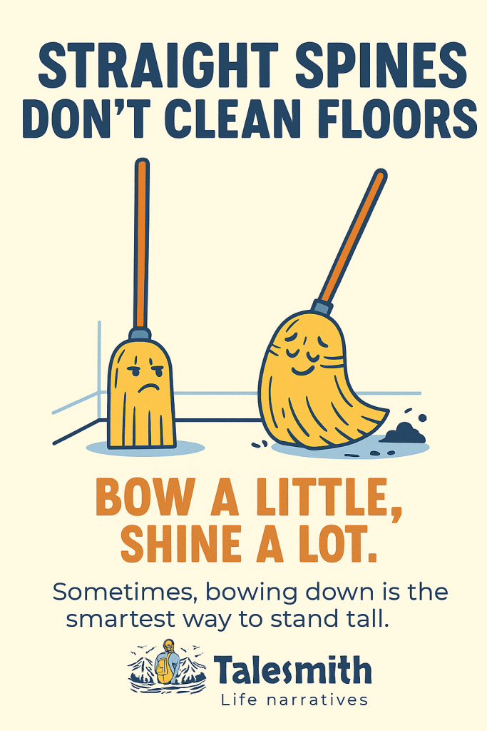 The old bent broom teaches us that flexibility wins. You don’t lose your dignity by bowing a little—you gain the power to chase away the cockroaches.