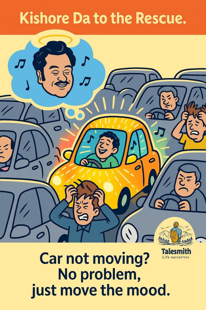 वो घर पहुँचा देर से, लेकिन थका हुआ नहीं, चिड़चिड़ा नहीं, गुस्से में नहीं। बल्कि किशोर दा गुनगुनाते हुए, मुस्कुराते हुए। जैसे तीन घंटे के ट्रैफिक जाम को तीन घंटे का म्यूजिक सेशन बना दिया हो।